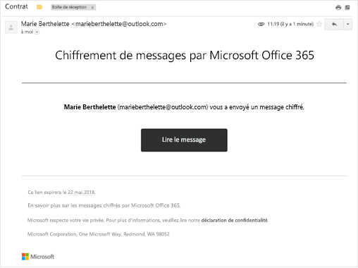 Vous recevrez un e-mail contenant des instructions pour lire le message chiffré. Si le message chiffré a été envoyé à un compte Google ou Yahoo Mail, vous pouvez vous authentifier à l’aide de votre compte Google ou Yahoo ou à l’aide d’un code secret temporaire. Si le message a été envoyé à un autre compte (Comcast ou AOL, par exemple), vous pouvez utiliser un code secret temporaire. Le code secret temporaire vous sera envoyé par e-mail.